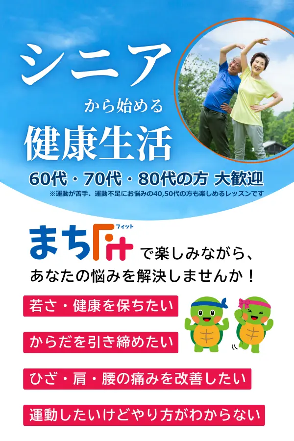 まちFitは、「いつまでも自分の足で歩き続けたい」「介護に頼らない毎日を送りたい」という想いを応援する、シニア向けの健康スタジオです。