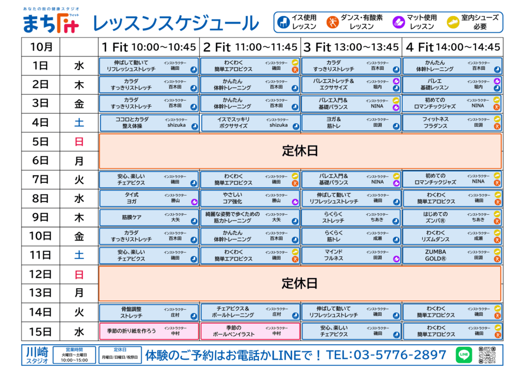 カラダを動かすレッスンの場合は運動しやすい服装でフェイスタオルやお飲み物などをお持ちください。