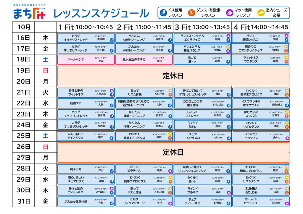 「まちFit」では毎日、カラダを動かす・自分の時間を楽しむ多種多様なレッスンが行われていますので、興味のあるレッスンにどんどん参加してください。なお、当日参加も可能ですが、事前に参加予約していただくことをお勧めします。